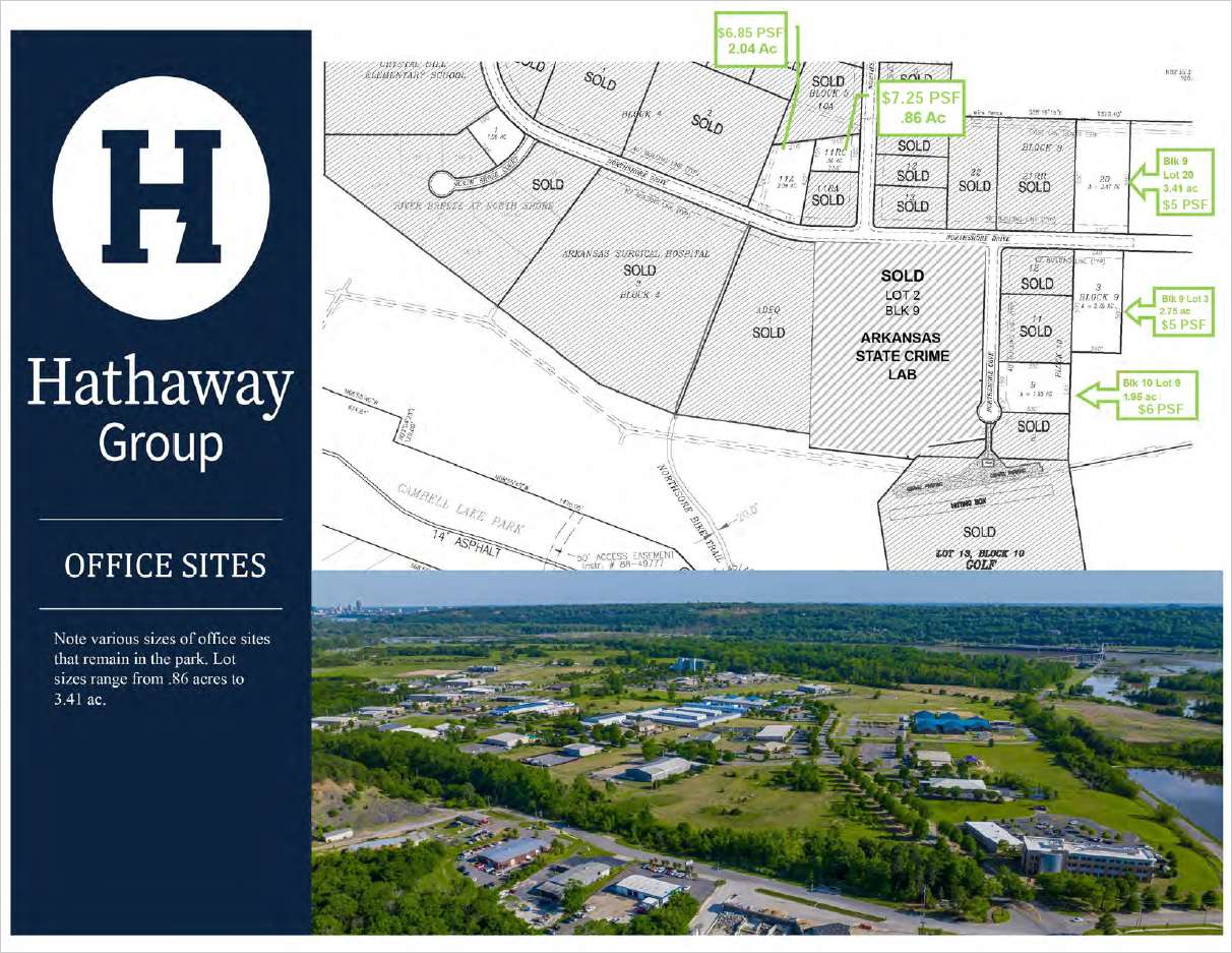 Ready-to-build lots start at just 0.80± acres, with retail, office, and mixed-use sites available — all backed by a thorough Bill of Assurance to ensure quality surroundings. Neighbors include Arkansas Surgical Hospital, two state agency headquarters, and NYSE-traded Montrose/CTEH, while Burns Park, the Arkansas River Trail, and Big Dam Bridge make this the most lifestyle-rich business address in the region.